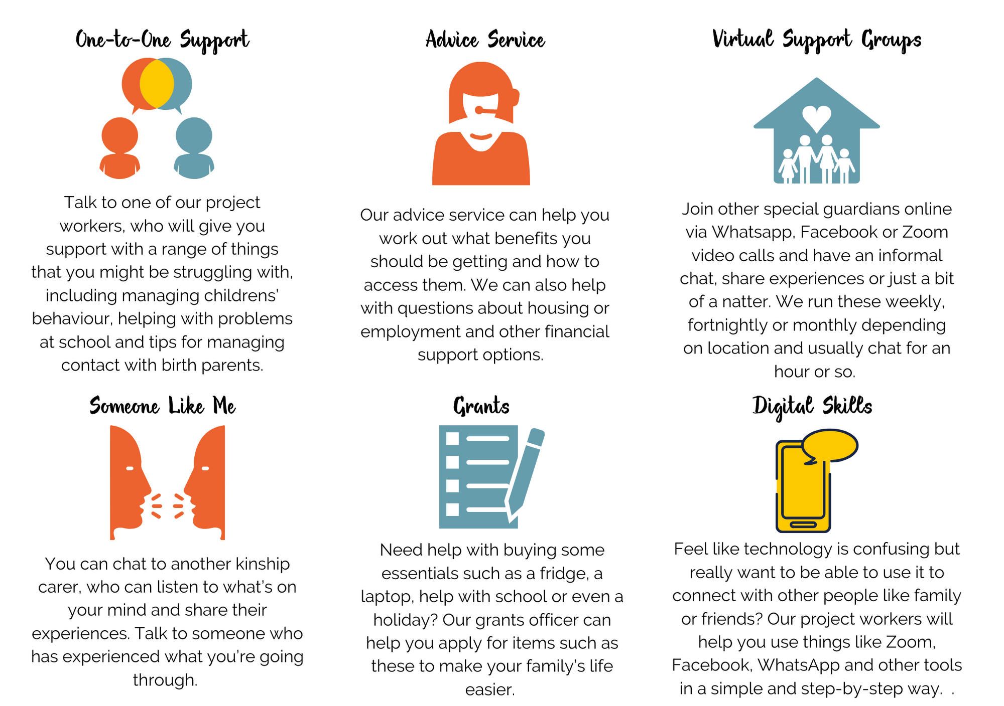 It follows a partnership model which requires collaboration with local authority partners. It supports kinship carers to: